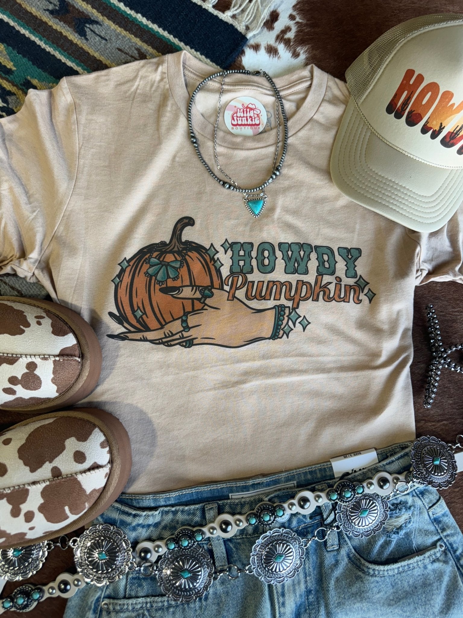 Fall vibes, meet Western style! This "Howdy Pumpkin" graphic tee in turquoise adds a touch of autumn flair with a friendly pumpkin greeting. Perfect for pumpkin spice lovers with a cowgirl spirit.
