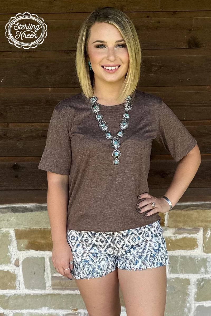 Our Simple Sterling Coffee Tee is the perfect pick-me-up for any wardrobe. It's a steaming hot sipper of style, boasting a bold coffee colored hue and a classic crew neck shape that's sure to keep you lookin' cool. No sugar needed - this treat is already sweet enough.