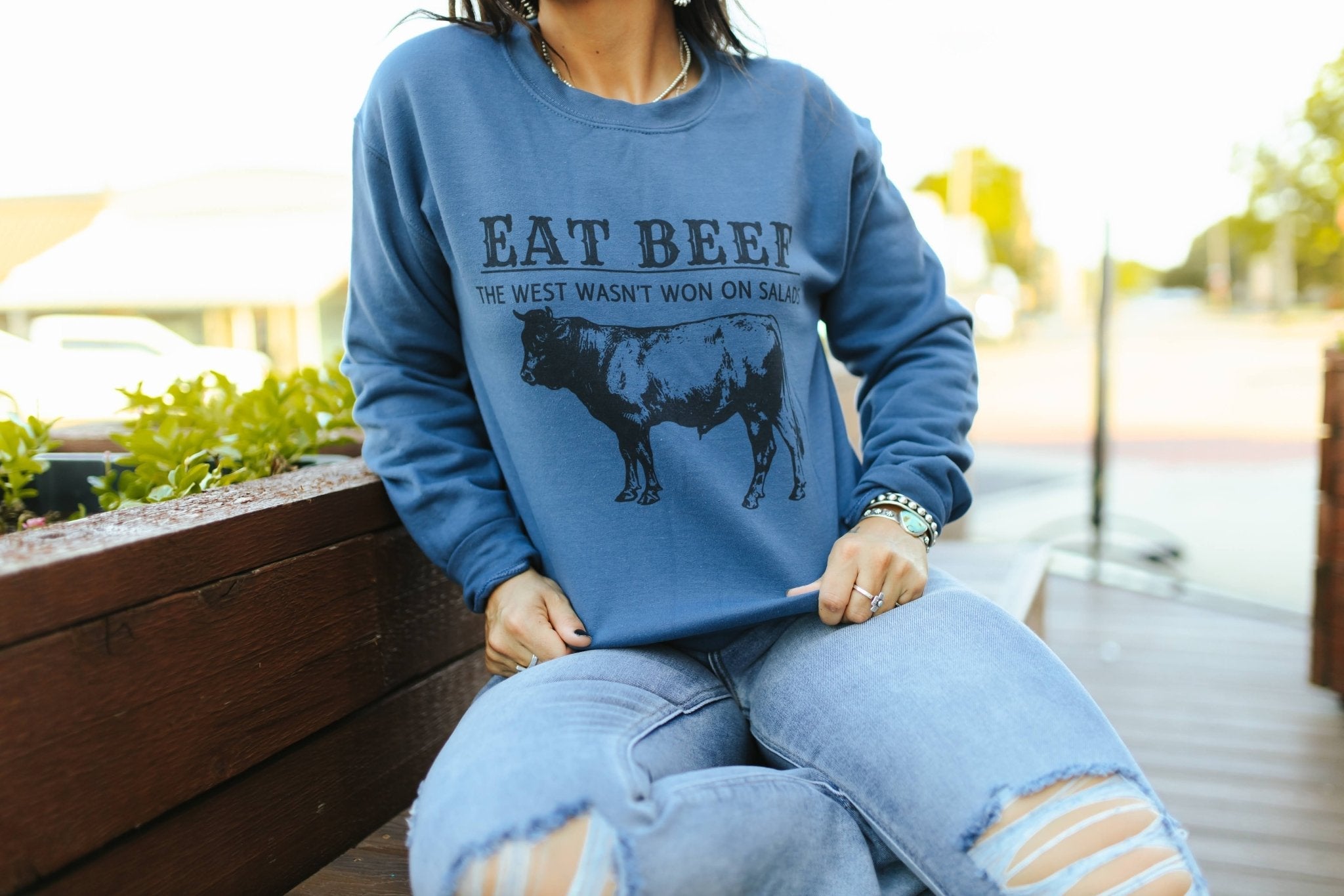 Own the range with our bold "The West Wasn't Won on Salads: Eat Beef" sweatshirt. This isn't just a shirt; it's a statement. Perfect for meat lovers and those who appreciate a good, old-fashioned cowboy spirit. Cozy and comfortable, it's the perfect way to show your pride in the heartland.